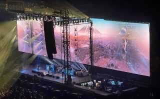 なんとそこには巨大な無観客スタジアムが。ここはスタジアムの控室だったんですね。ということで2曲目は「盛夏光年」。スタッフから別のギターを受けとるMonster。お、真っ赤に輝くこのギターはGibson Monsterモデルですね。アジアで2人目のGibson シグネチャーモデルを手にしたMonster、すっかりライブでも定着した彼の代名詞ともいえるギターです。石頭はそのままギターを持ってきています。